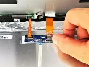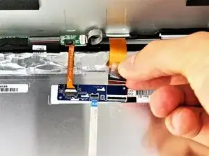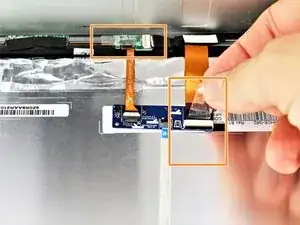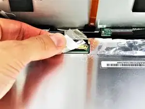 Отклейте ленту от разъёма с более толстым оранжевым жгутом проводов и от разъёма на небольшой зелёной плате.