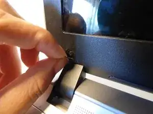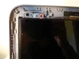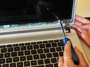 Используйте крестовую отвёртку 3 мм, чтобы снять 4 чёрных винта, расположенных на металлических полосках над и под углами экрана.