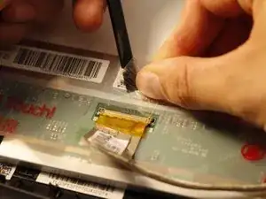 Две панели соединены четырьмя гибкими шлейфами. Каждый шлейф имеет фиксирующую площадку, которую нужно освободить перед снятием. Пальцами начните с двух шлейфов, ближайших к краю.