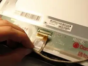 Переверните блок дисплея. Медленно снимите выходной кабель из зажимов, удерживающих его на месте.