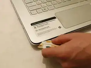 Проведите картой по периметру ноутбука, чтобы отщёлкнуть все защёлки.