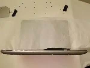 Используя отвёртку Phillips #0, отвинтите винт под чёрной резиновой накладкой, а также другие винты, удерживающие чёрные угловые пластиковые элементы с левой и правой стороны.