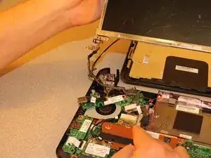 Не вытаскивайте клавиатуру сразу - там есть потенциально хрупкий шлейф, который подключен к материнской плате за клавиатурой.