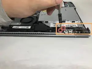 После того как все края задней крышки будут освобождены, используйте инструмент для вскрытия, чтобы аккуратно отстегнуть защёлки, удерживающие заднюю крышку у привода CD.