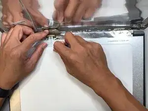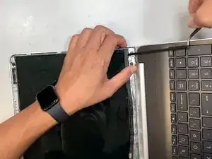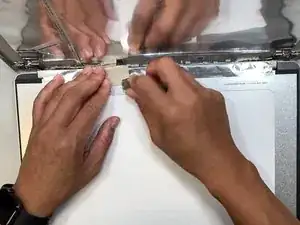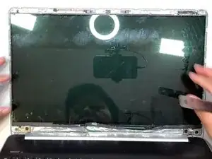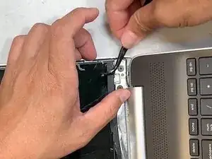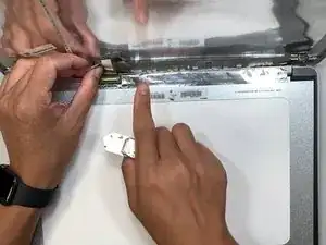 Переверните экран задней стороной вверх, чтобы увидеть скотч, соединяющий экран с корпусом ноутбука.
