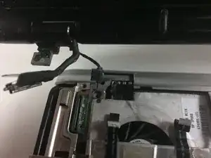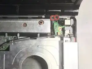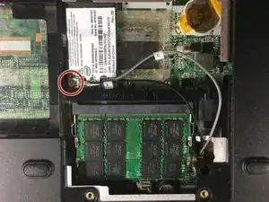 Переверните ноутбук и отвинтите крепление длиной 7 мм, удерживающее провода на месте, затем протяните провода через ноутбук на другую сторону.