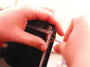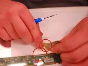После снятия чёрной клейкой ленты требуется выкрутить два маленьких винта в нижних углах экрана (поместите винты на кусочек ленты).