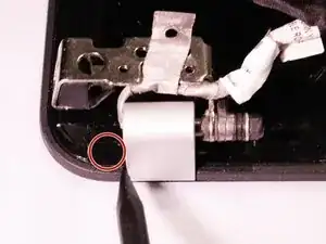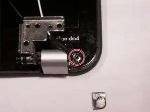 Снимите каждую пластиковую накладку (2), закрывающую винты, расположенные рядом с металлическим шарниром, соединяющим экран с корпусом.