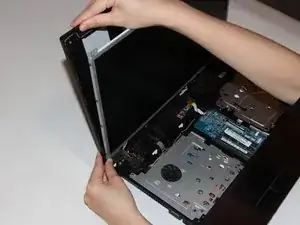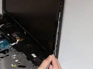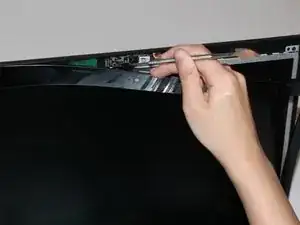 С помощью металлической лопатки отожмите защёлки за рамкой экрана.