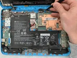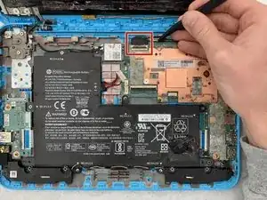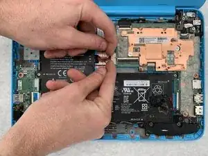 Снимите питание с материнской платы, отсоединив кабель аккумулятора от его разъёма пальцами или лопаткой.