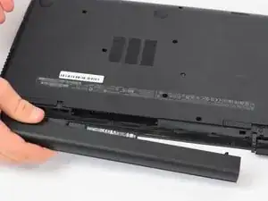 Нажмите обе защёлки к центру ноутбука и потяните, чтобы снять аккумулятор.