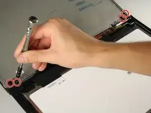 Выверните четыре винта 3/16” в верхней части ноутбука рядом с петлями отверткой Phillips #00.