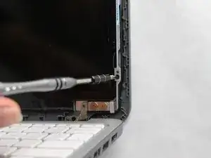 Удалите один винт диаметром 3 мм, расположенный под обоими клеевыми слоями, с помощью отвертки Phillips #0.
