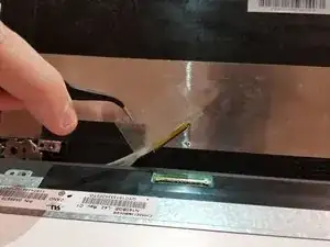 Отклейте ленту, чтобы открыть металлическую защёлку крепления кабеля дисплея.
