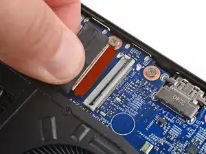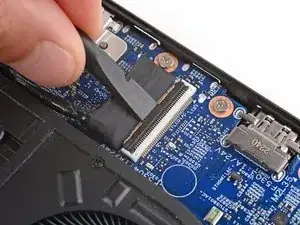 Используйте плоский конец лопатки, чтобы поднять фиксатора на ZIF‑разъёме кабеля экрана рядом с правым краем ноутбука.