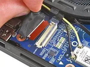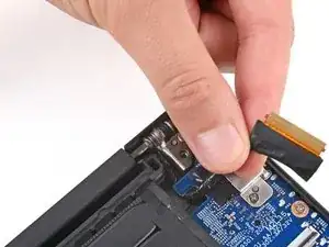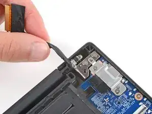 Используйте плоский конец лопатки, чтобы поднять фикcатор на ZIF‑разъёме кабеля экрана рядом с левым краем ноутбука.