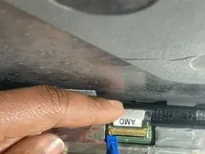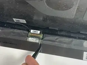 Чтобы отсоединить соединитель дисплейного кабеля, аккуратно подденьте ваш инструмент под зажим. Затем поверните зажим на другую сторону разъема, чтобы он лег плоско на кабель.