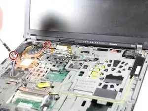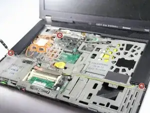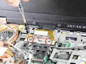 Удалите два винта 3 мм рядом с петлями крышки, а также два винта 3 мм на ленточном кабеле крышки.