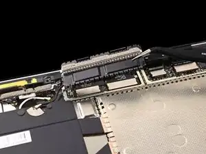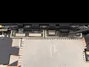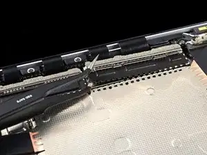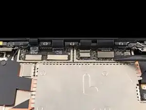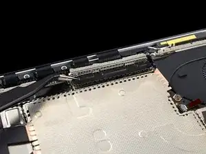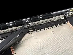 Вставьте один зубец пинцета под угол правой экранирующей пластины кабеля дисплея.