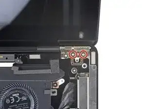 Удерживая экран устойчиво, используйте отвертку T6 Torx, чтобы снять два оставшихся винта длиной 5,9 мм, крепящие экран (по одному с каждой стороны).