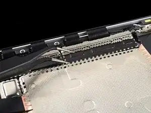 Повторите два предыдущих шага, чтобы снять кожух левого кабеля дисплея.