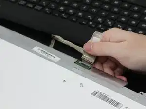Переверните экран и аккуратно отклейте ленту, удерживающую разъём на месте.