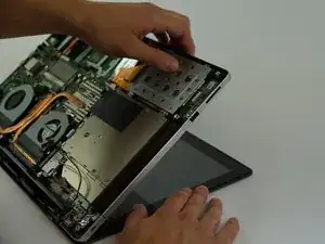 Снова откройте ноутбук и аккуратно отделите основание ноутбука от дисплея.
