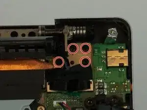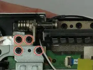 Снимите восемь чёрных винтов Phillips #1 4 мм, удерживающих дисплей на основании ноутбука.