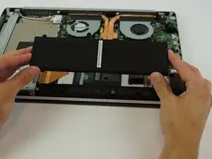Двумя руками поднимите аккумулятор вертикально и выньте его из устройства.