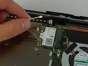 Снимите тонкие чёрный и белый провода с разъёмов Wi‑Fi-карты.