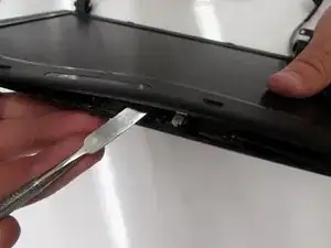 Используя синие пластиковые инструменты для поддевания или лопатку, зазубрите один инструмент между задней крышкой и корпусом ноутбука.