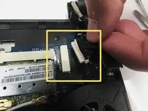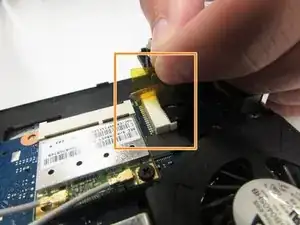 После удаления жёлтой ленты отсоедините чёрный кабель от его разъёма на материнской плате.