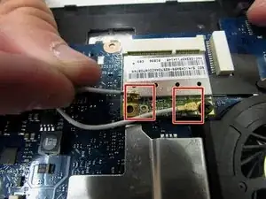 Отстегните два белых провода, подключенных к микросхеме на материнской плате, потянув белый провод на себя.