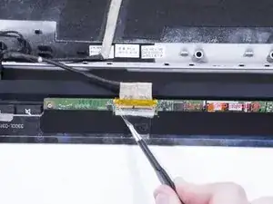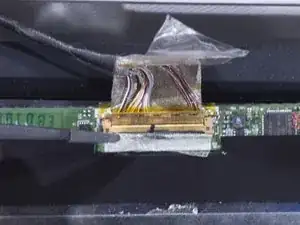 Разместите экран лицевой стороной вниз на клавиатуре. Единственное соединение, которое осталось у экрана с ноутбуком — это его кабель подключения. Существует кусок ленты, накрывающий кабель подключения экрана. Используя пинцет, снимите эту ленту.
