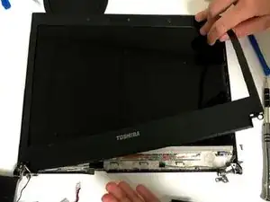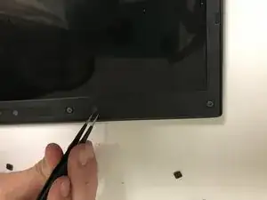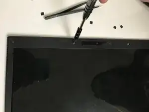 С помощью пинцета снимите пластиковые заглушки с верхнего края экрана ноутбука, рядом с фронтальной камерой. Все заглушки, кроме ближайшей к камере, должны быть удалены.