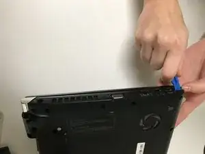 Удерживая разблокирующую защёлку, потяните батарею от корпуса ноутбука.