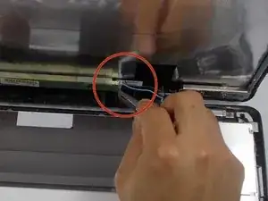 Отсоедините ленту, расположенную над соединением экрана с ноутбуком, и отсоедините соединение пинцетом, потянув назад.