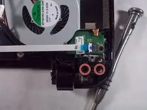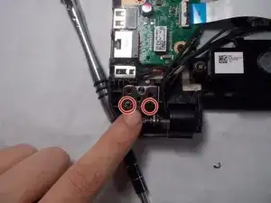 Удалите два винта с крестообразной головкой 6,5 мм, показанные на иллюстрации, используя отвертку Phillips #00.