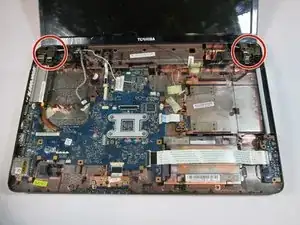 Экран закреплён двумя петлями с обеих сторон ноутбука.