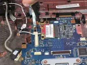 Сдвиньте металлический разъём кнопки питания из его порта, чтобы можно было освободить чёрный провод и переместить его из-под разъёма.