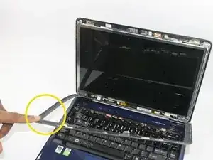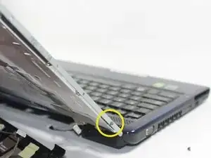 Переверните ноутбук так, чтобы вы могли увидеть крышку. Аккуратно отодвиньте крышку от экрана, чтобы увидеть белые защелки около основания экрана, как показано на картинке.
