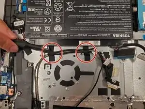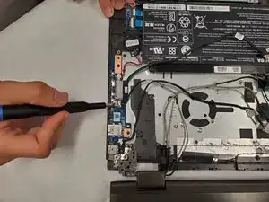 Отсоедините маленький бежевый разъём, фиксирующий вентилятор к плате, и извлеките узел вентилятора с радиатором из корпуса ноутбука.