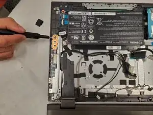 Удалите всю чёрную ленту, фиксирующую шарнир к корпусу ноутбука.