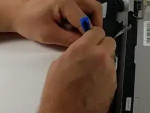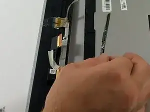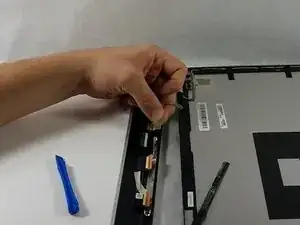 Используя пальцы или пластиковые инструменты для вскрытия, отведите ленту сверху и снизу в месте крепления оставшегося провода, соединяющего экран с ноутбуком.
