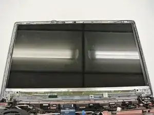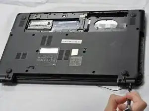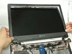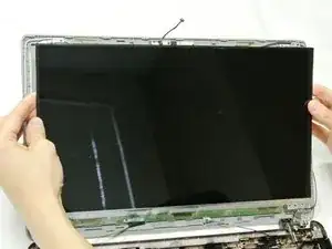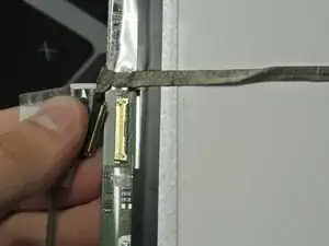 Снимите ленту с кабеля, подключённого к задней части экрана ЖК-дисплея, и отключите кабель, который подсоединён снизу. Экран теперь полностью удалён из корпуса ноутбука.