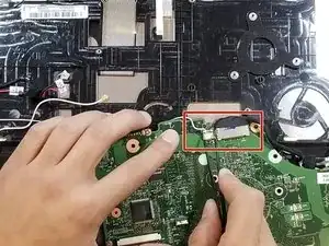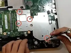 Удалите винт PH#1 10 мм, фиксирующий материнскую плату к корпусу.