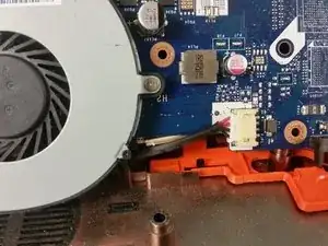 Поднимите материнскую плату. Гнездо питания всё ещё подключено к плате, поэтому не оттягивайте плату слишком далеко.