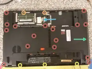 Расположив ноутбук так, чтобы сторона с аккумулятором была обращена к Вам, используйте отвертку с тонким наконечником или лопатку, чтобы сдвинуть защёлку аккумулятора влево.