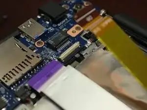 Два кабеля, проходящие над жестким диском, нужно будет отключить; для этого поднимите разъем, как показано.