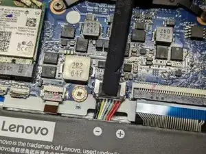 Используйте плоский конец лопатки, чтобы нажать на квадратную перемычку разъёма батареи и выдвинуть его из гнезда.
